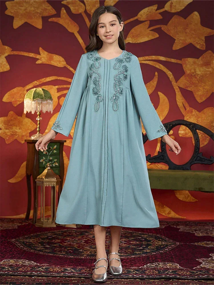 LM219 Girls Eid Dress – Embellished V-Neck, Long Sleeve Modest Party Gown (8–12Y)