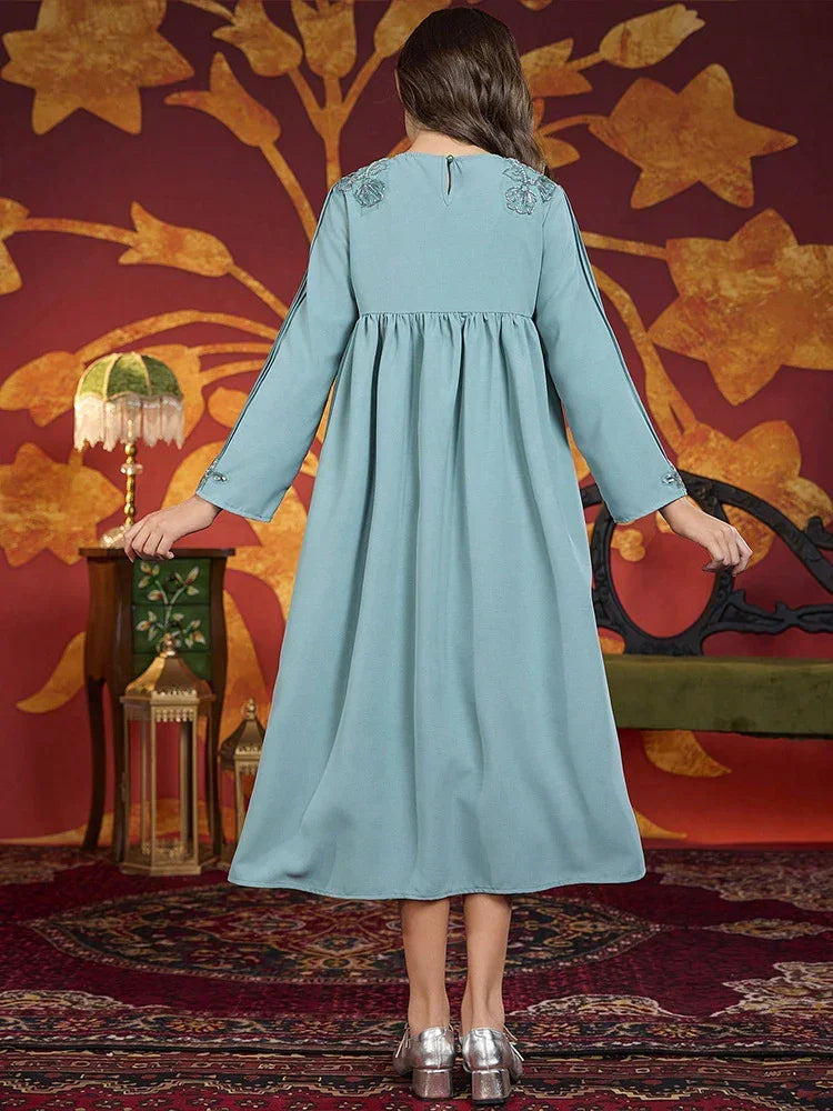 Make every celebration picture-perfect with the LM219 girls Eid dress — a modest, full-length gown featuring a delicately embellished V-neck bodice, long sleeves and a graceful A-line skirt that twirls beautifully.