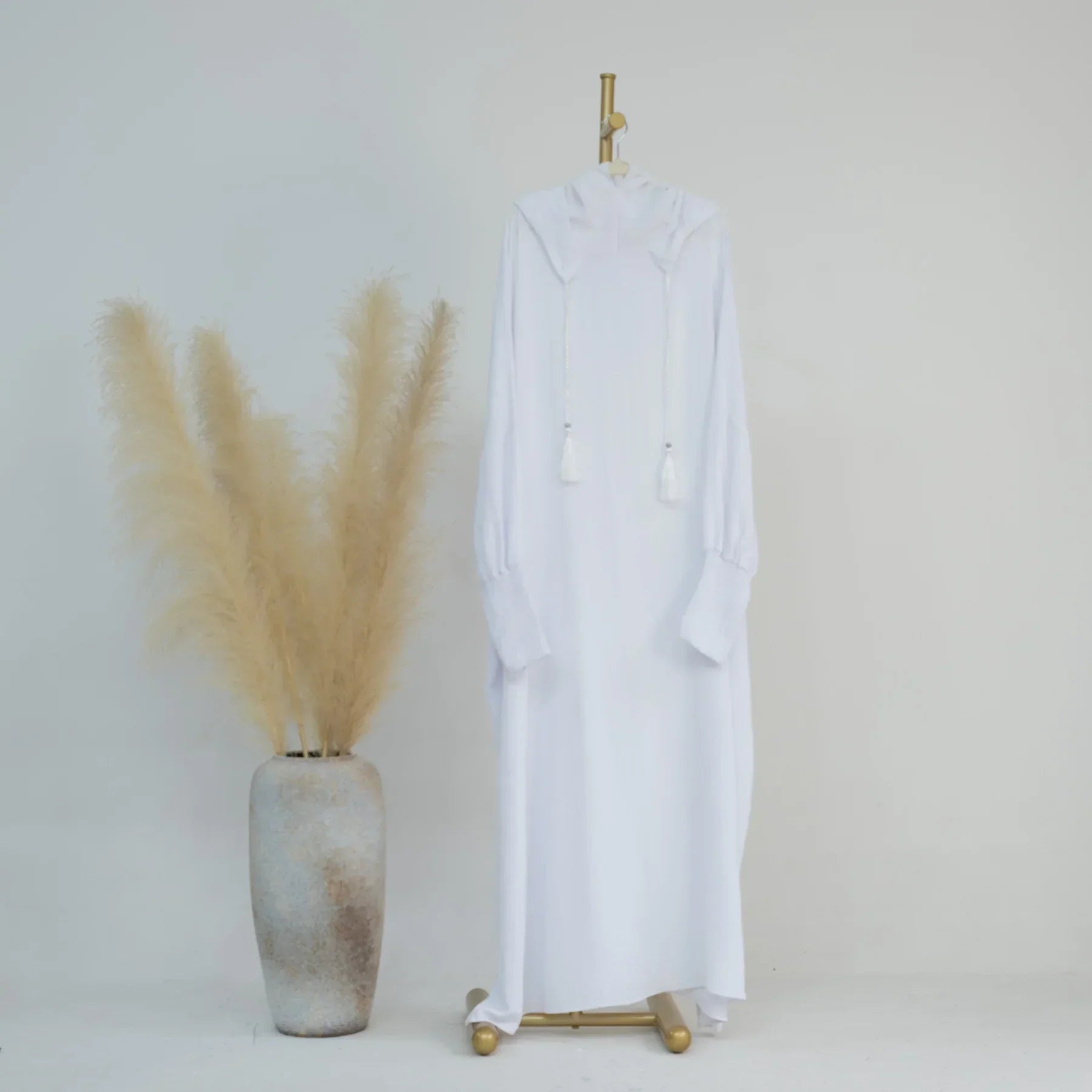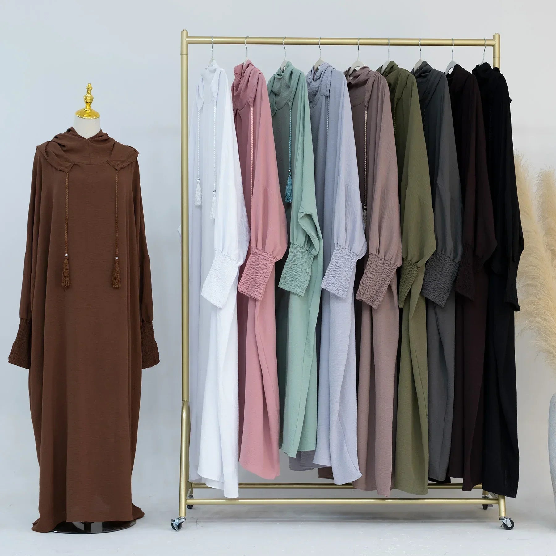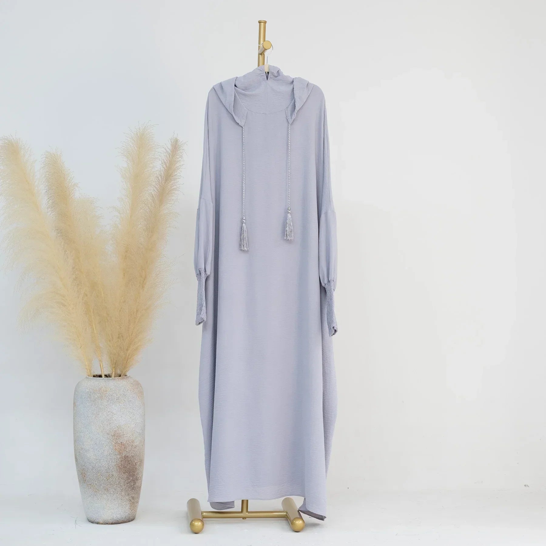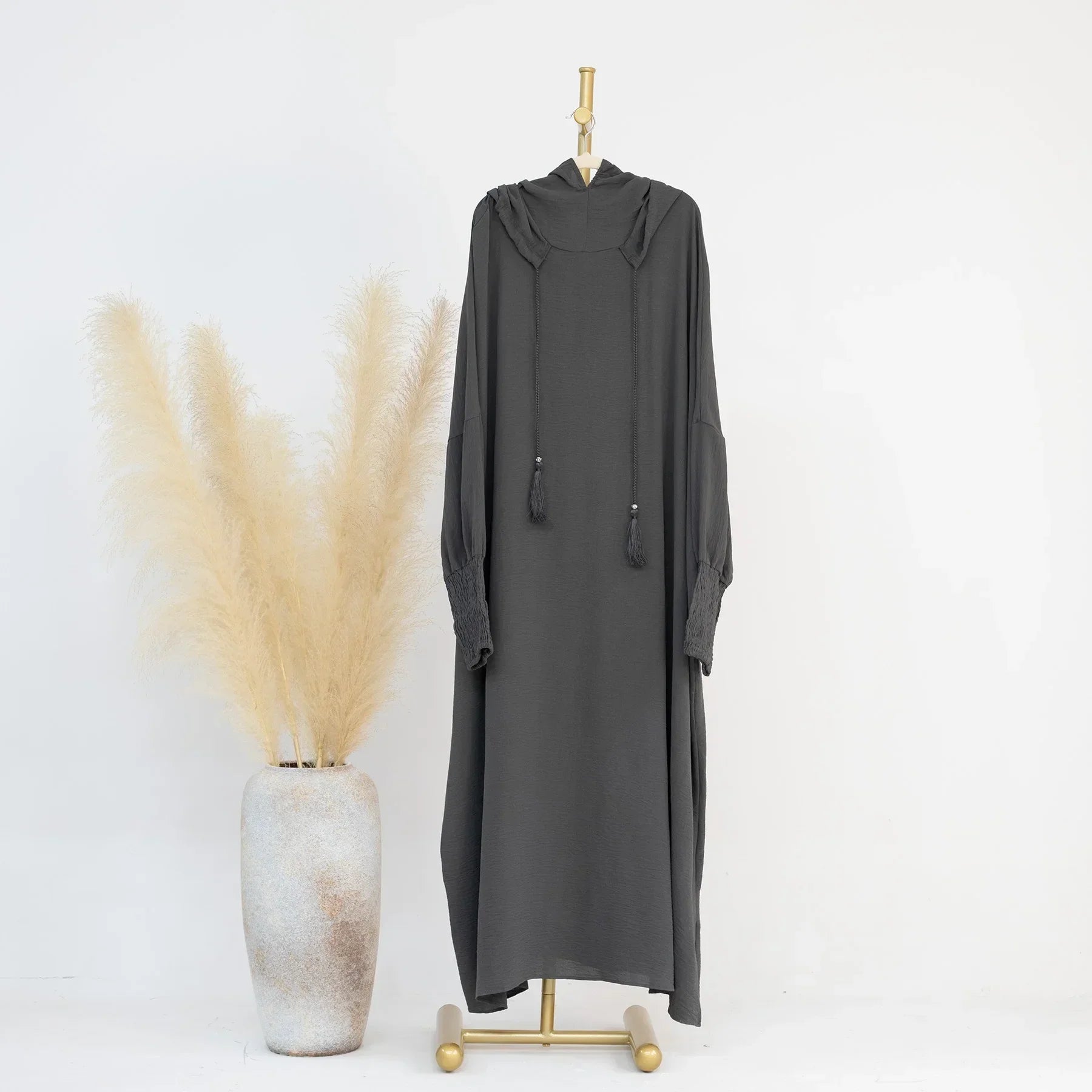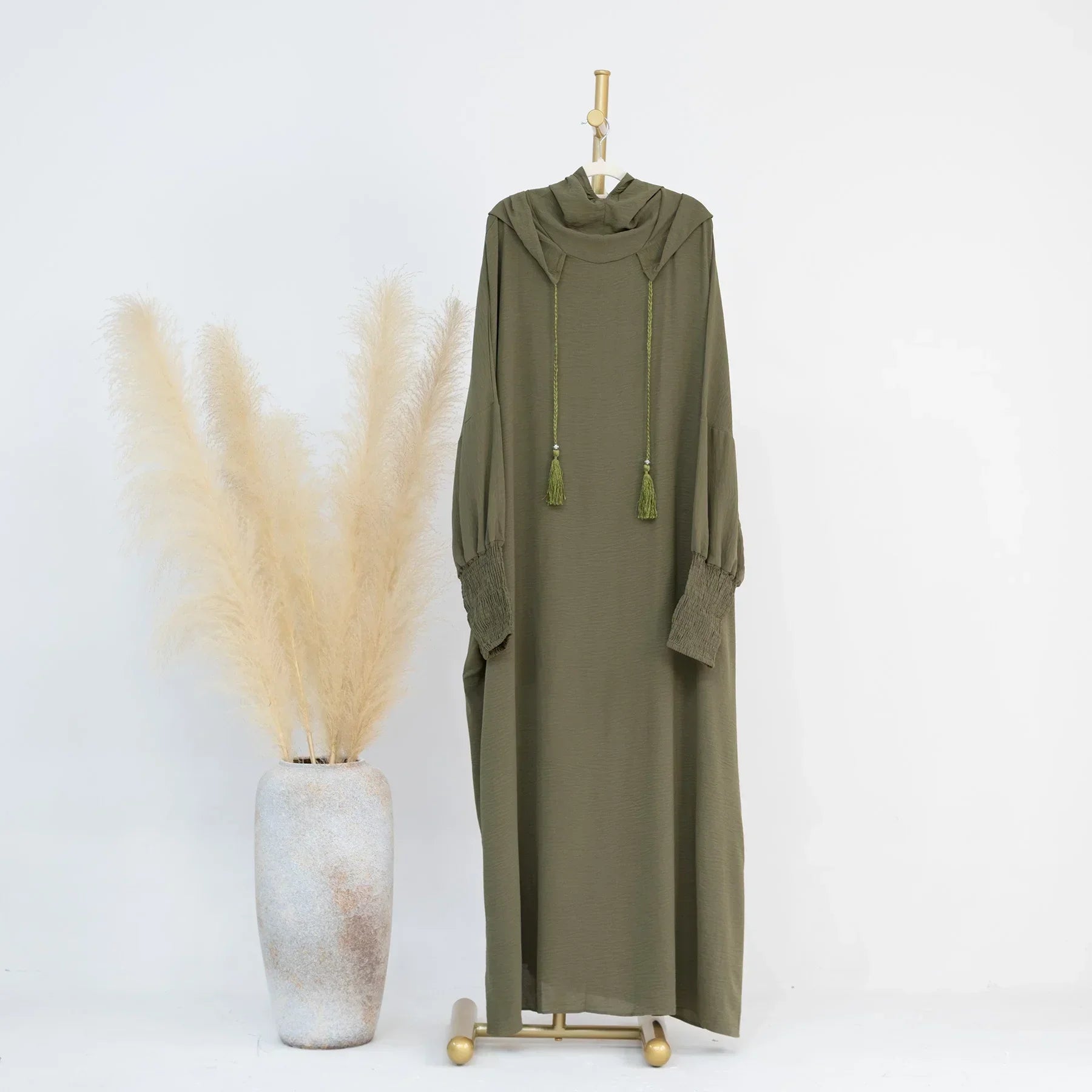 LM220 Hooded Abaya Dress for Women – Batwing Sleeve, Drawstring Hood, Shirred Cuffs, Solid Color