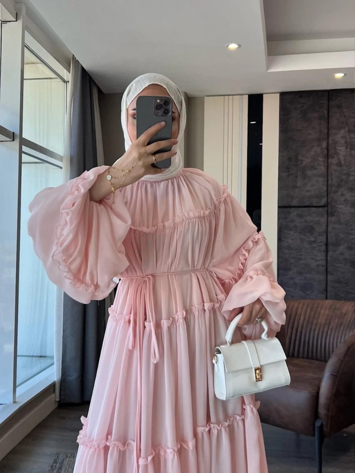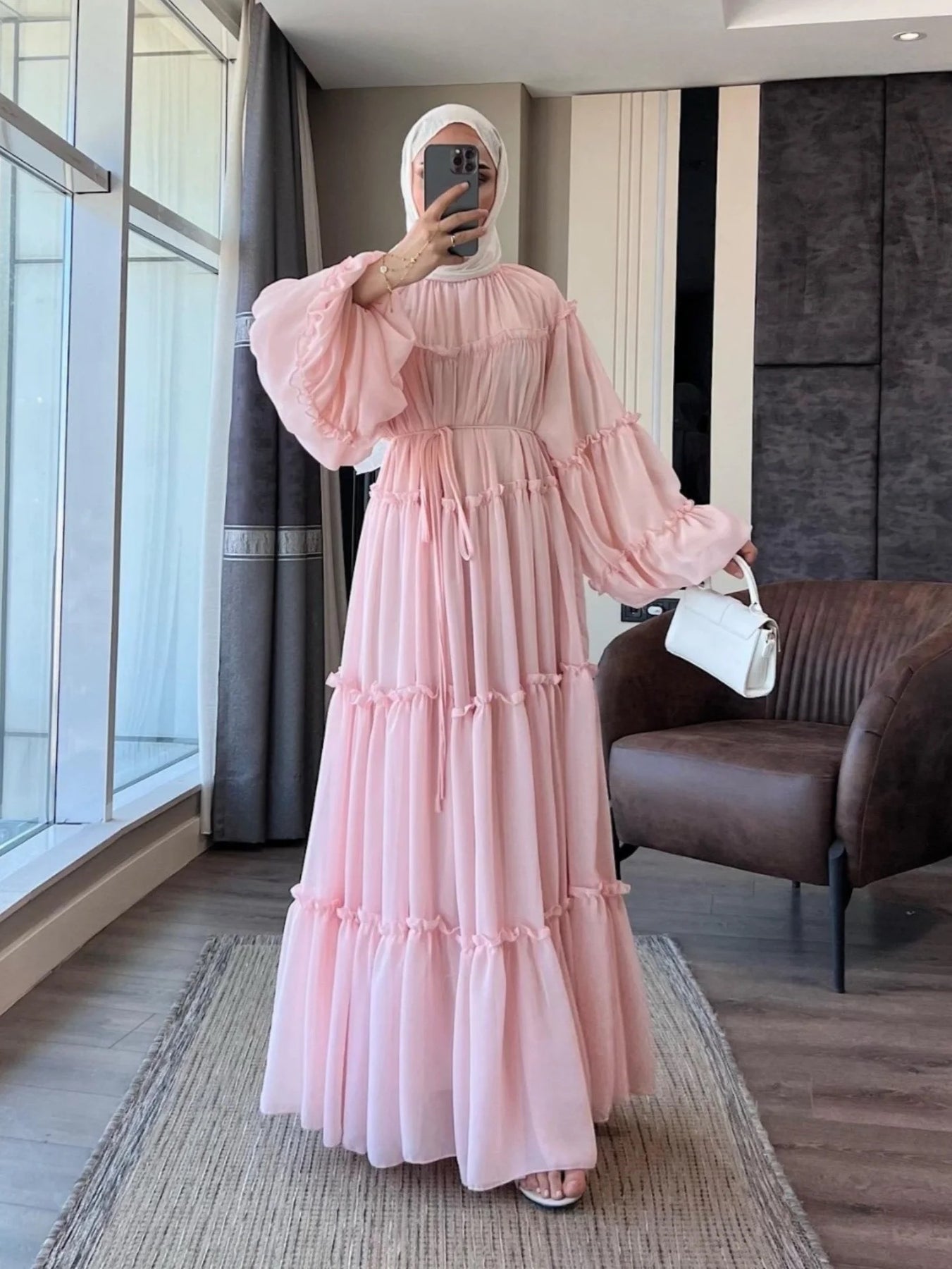 Discover the LM318 Luxury Tiered Abaya Dress - an exquisite long-sleeve modest dress featuring a beautiful tiered skirt design. This sophisticated piece combines premium craftsmanship with elegant styling, perfect for the modern woman who values both luxury and modesty.