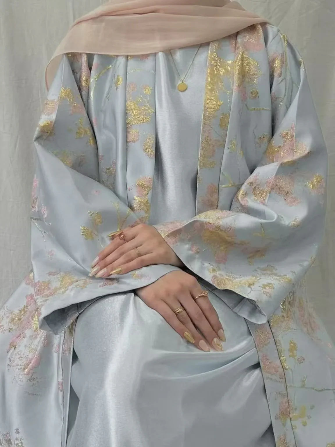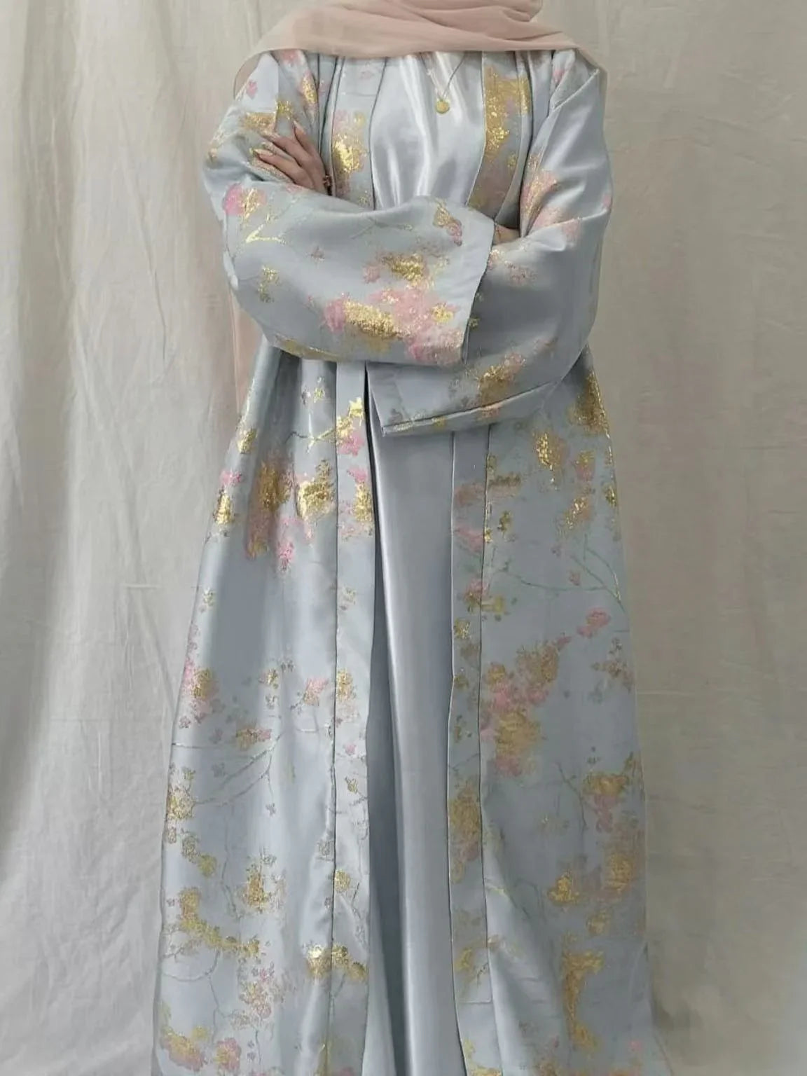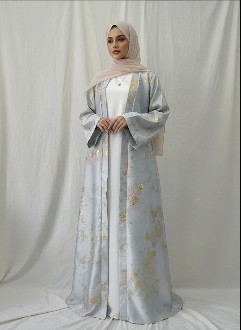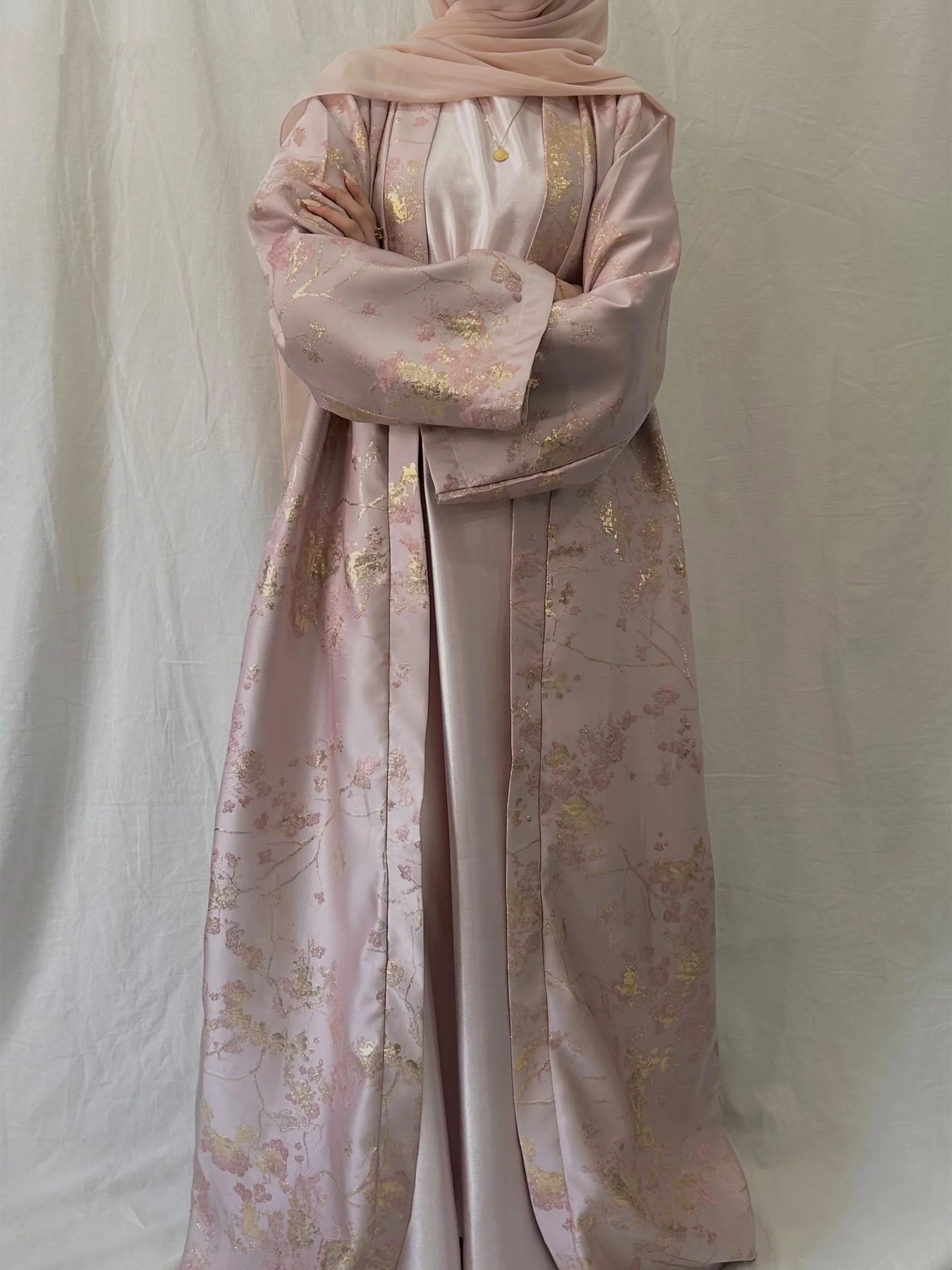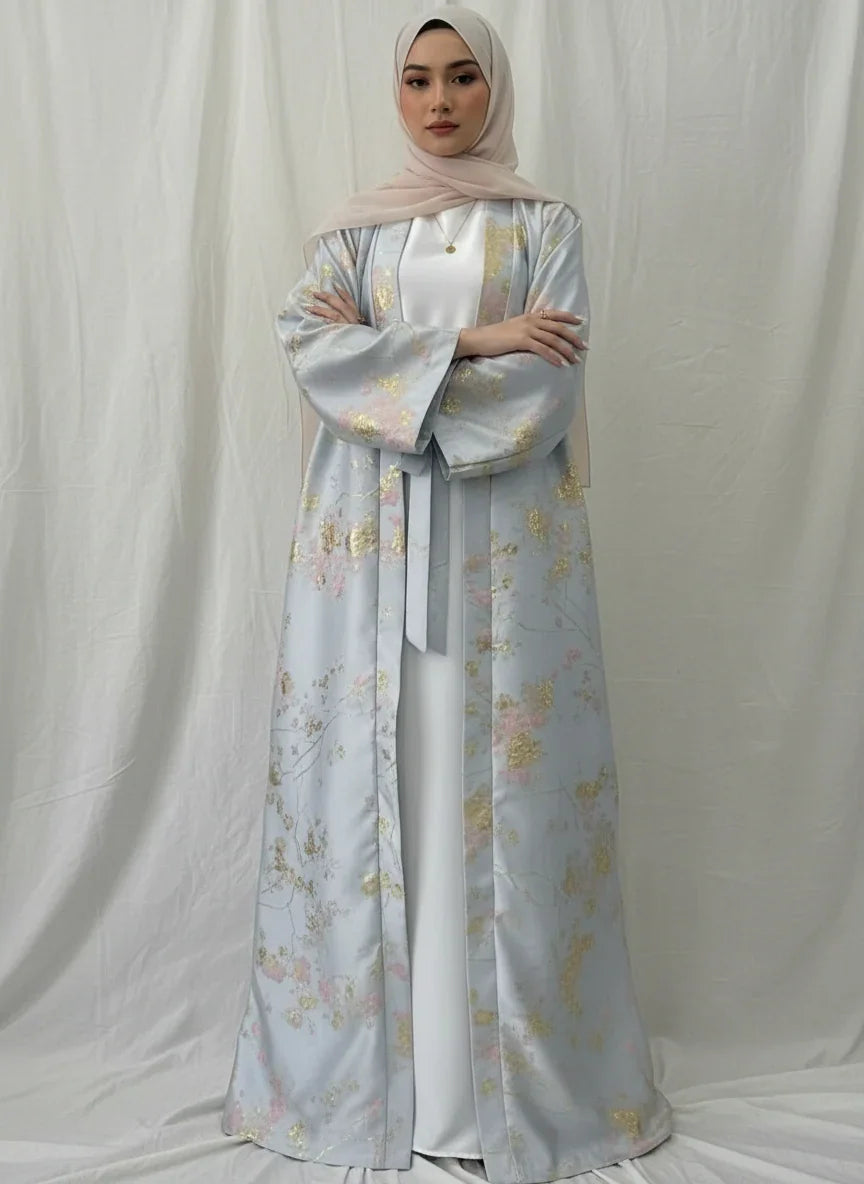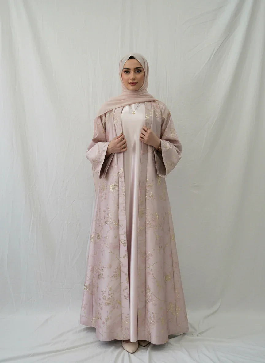 Elevate your occasion wardrobe with this Sakura Pink kimono abaya dress (LM178). Crafted with delicate golden embroidery and a soft, breathable fabric, it drapes beautifully and flatters a range of body types—perfect for Eid, weddings and formal evenings.
