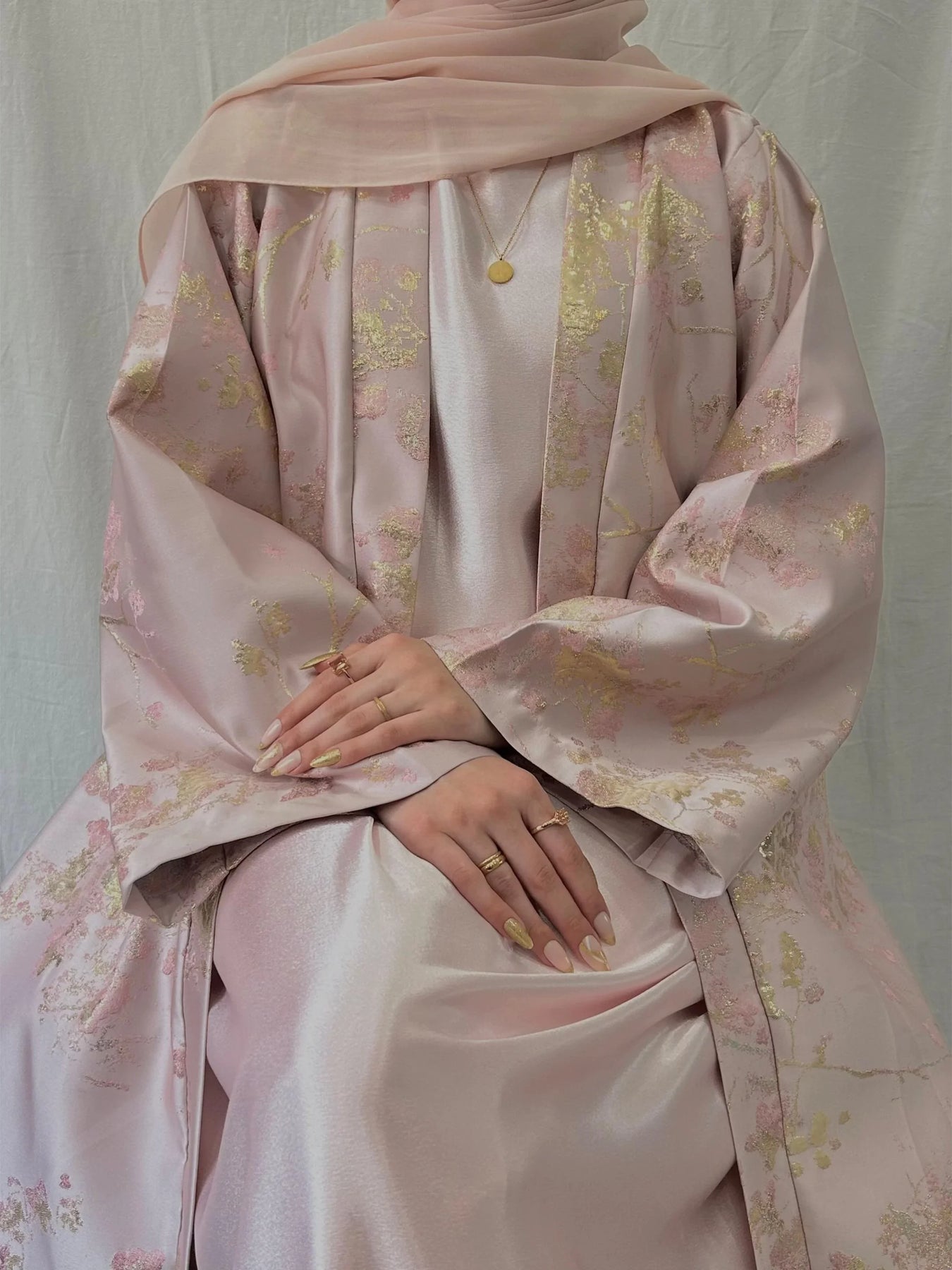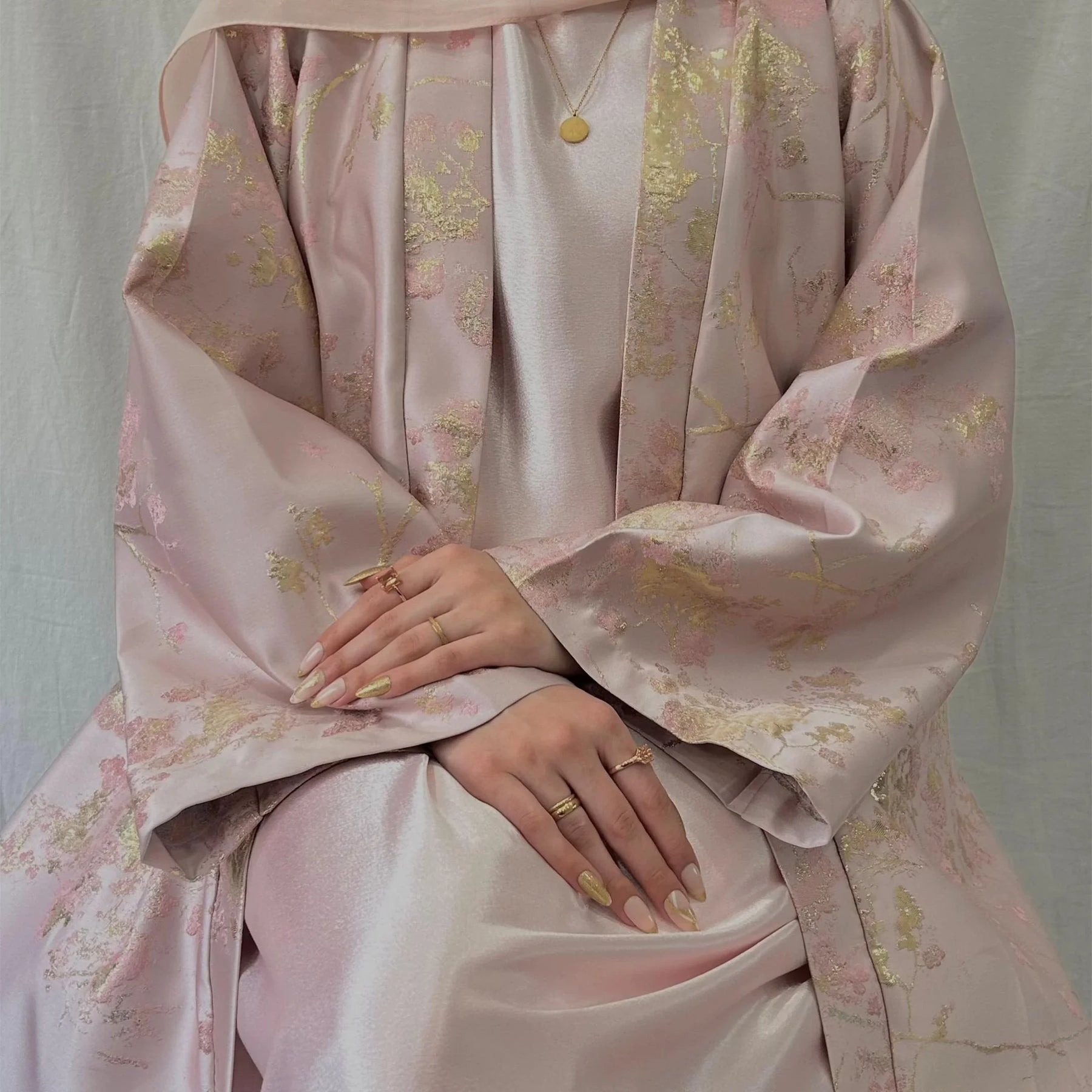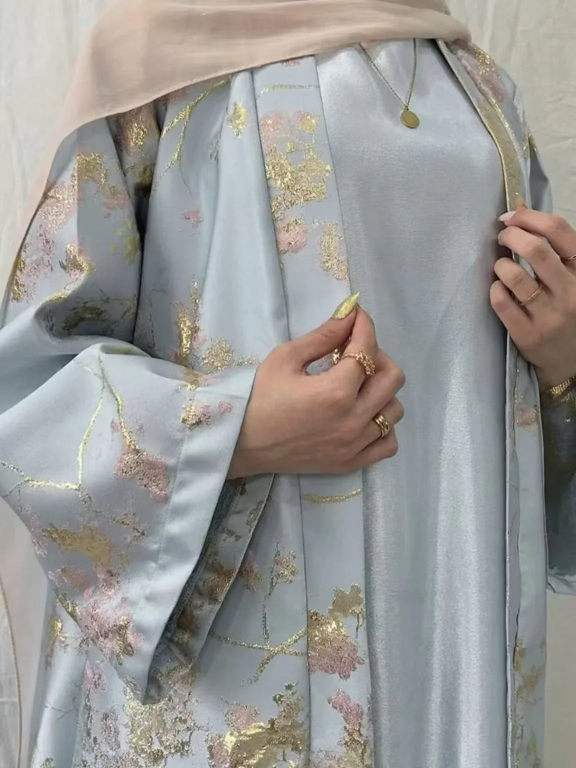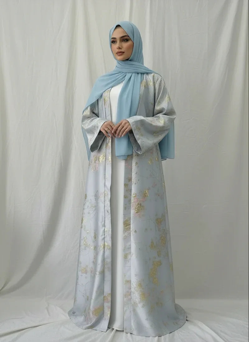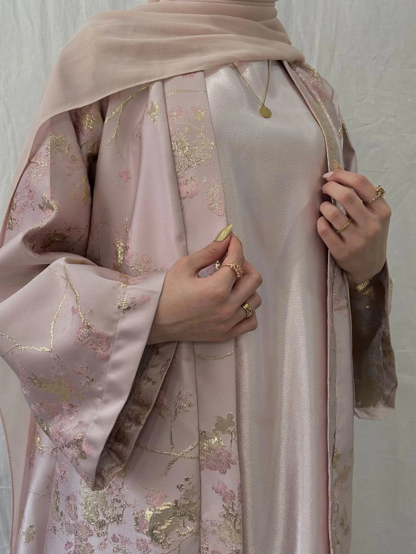 Elevate your occasion wardrobe with this Sakura Pink kimono abaya dress (LM178). Crafted with delicate golden embroidery and a soft, breathable fabric, it drapes beautifully and flatters a range of body types—perfect for Eid, weddings and formal evenings.