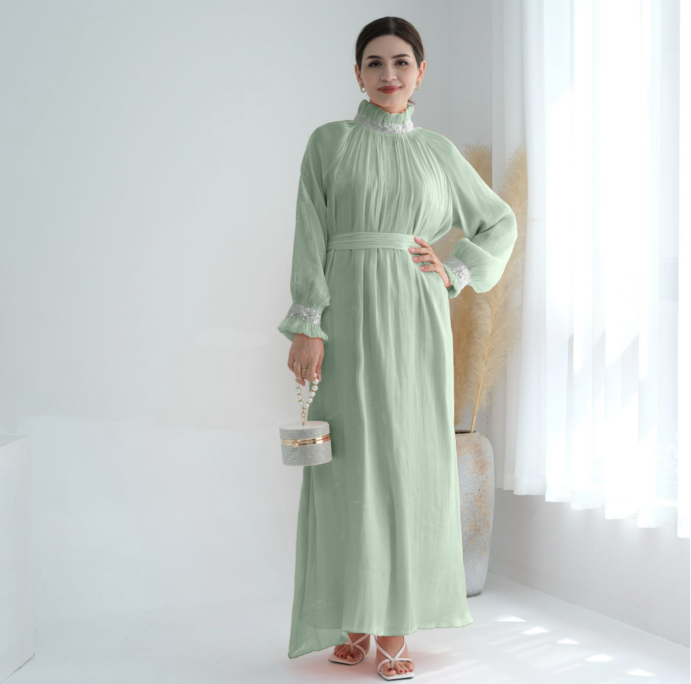 LM024 Shimmering Sequin Abaya Maxi Dress with Belt – Modest Evening Wear