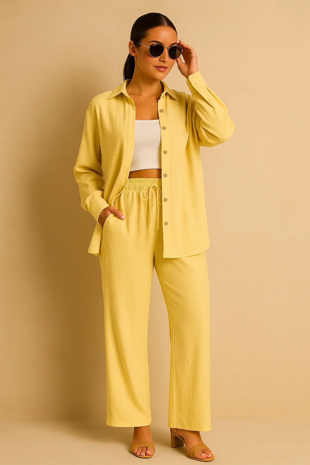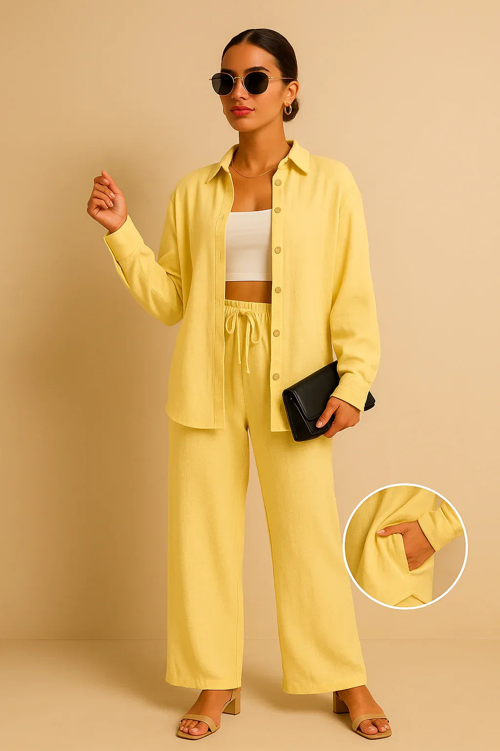 LM131 Women’s Solid Button Front Shirt& Tie Front Wide Leg Pants With Pocket Tow-piece Set