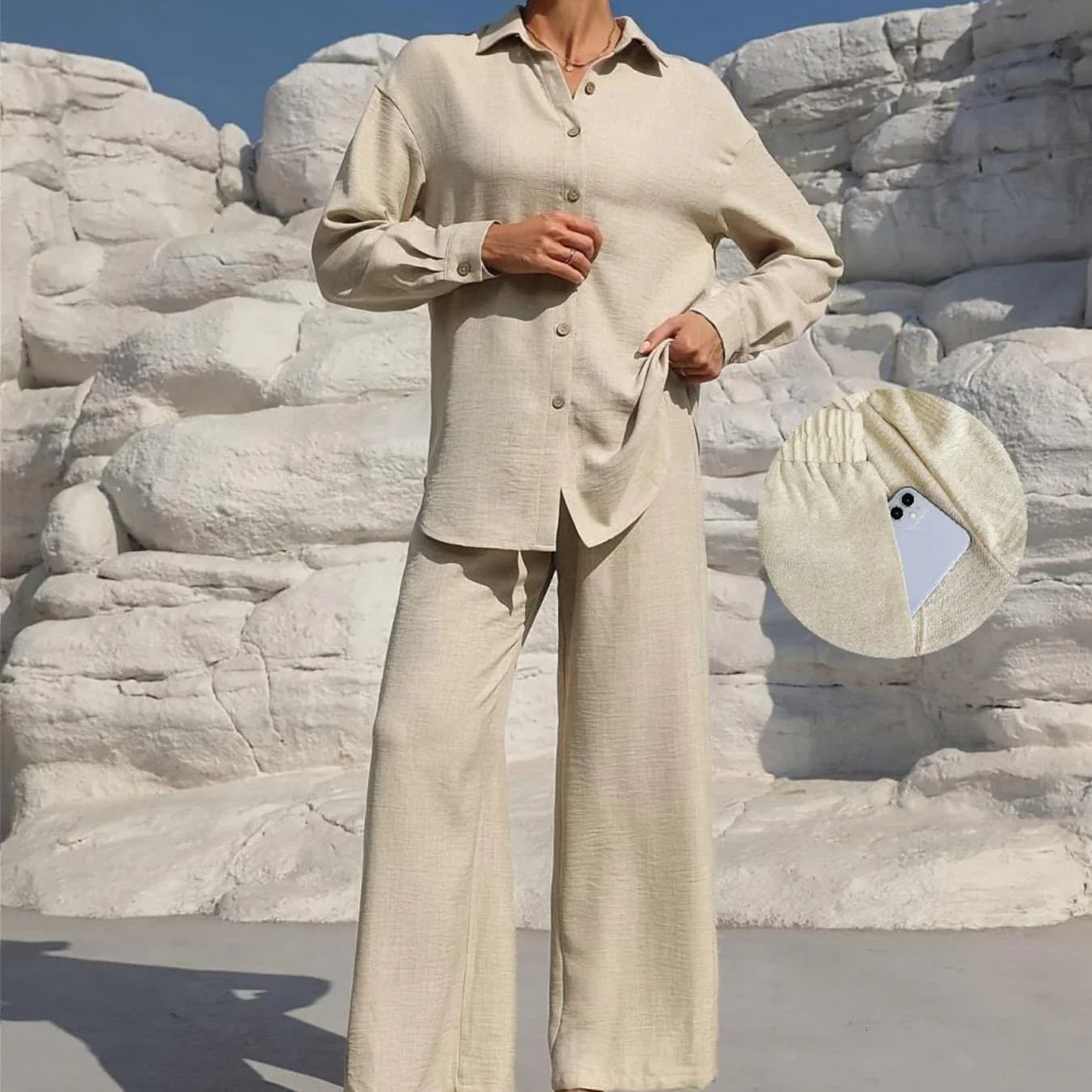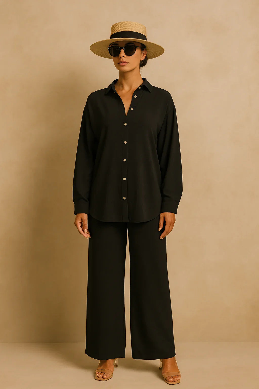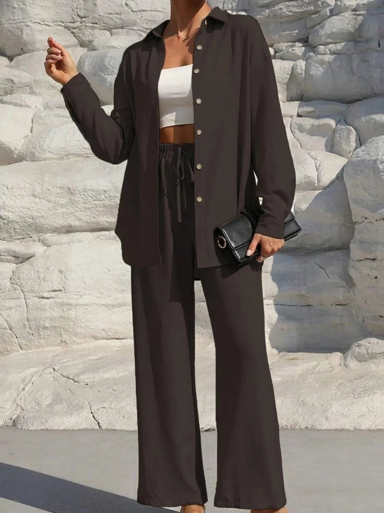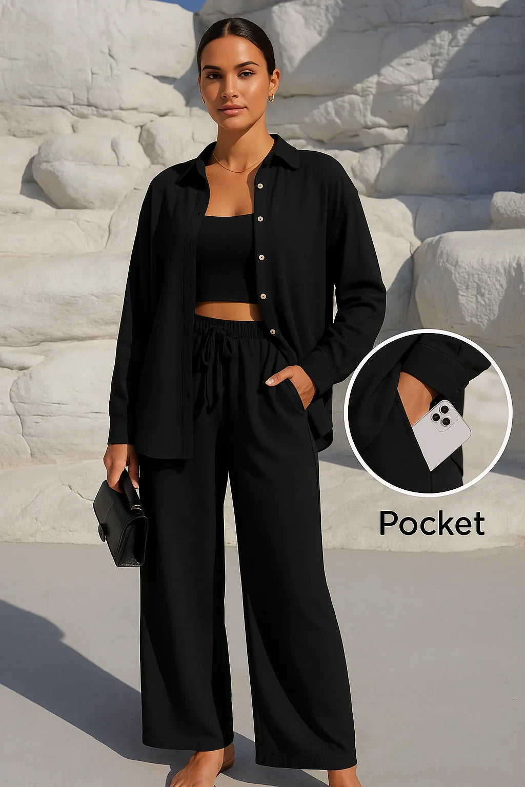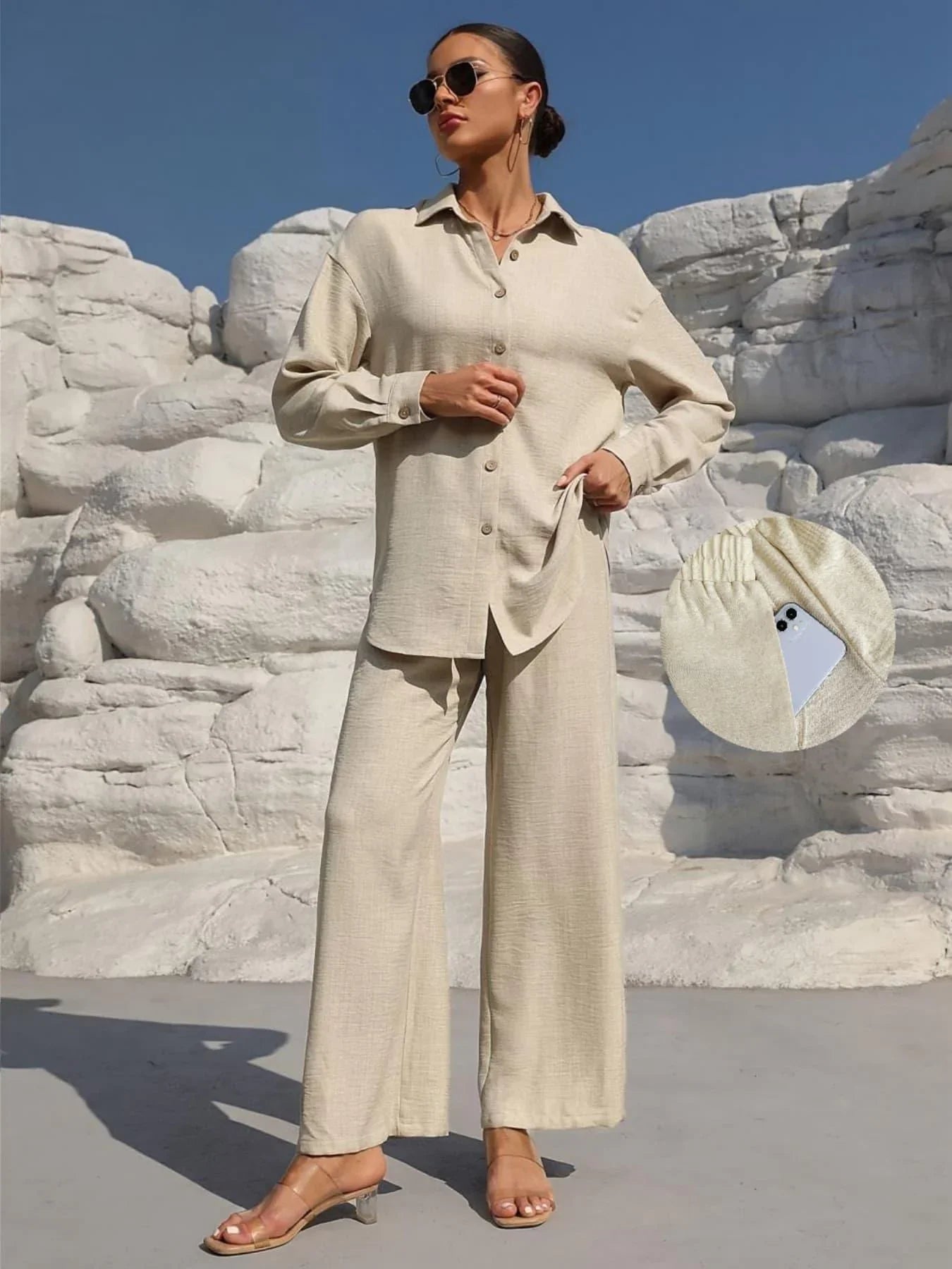 LM131 Women’s Solid Button Front Shirt& Tie Front Wide Leg Pants With Pocket Tow-piece Set - 131 huihe S LumosModesty