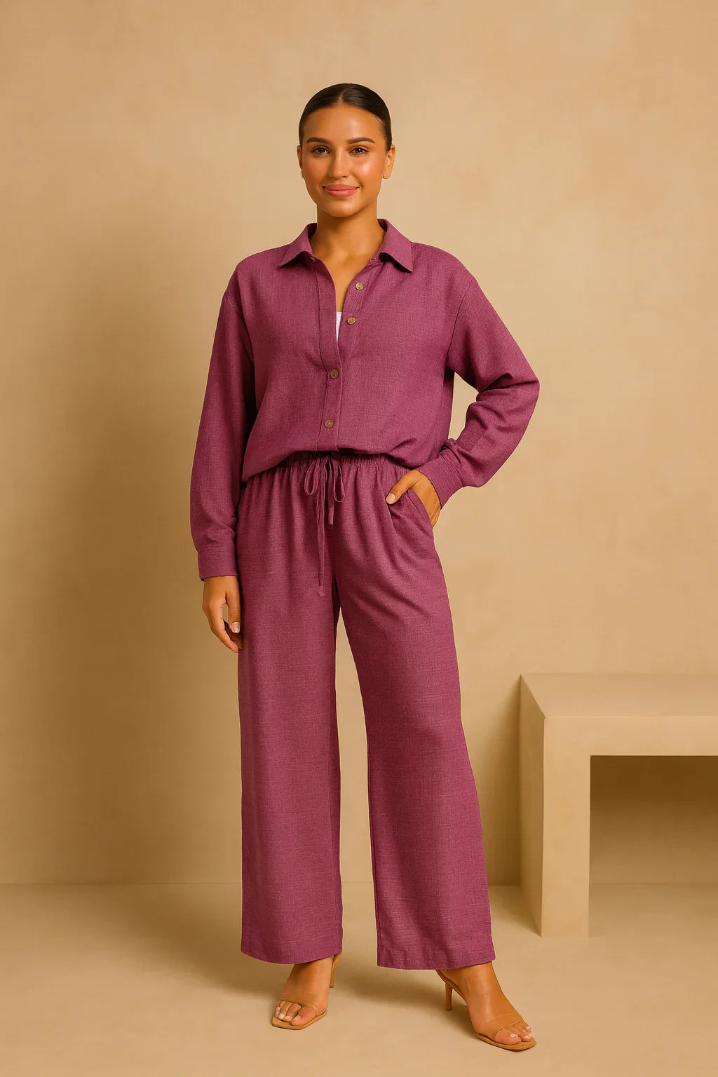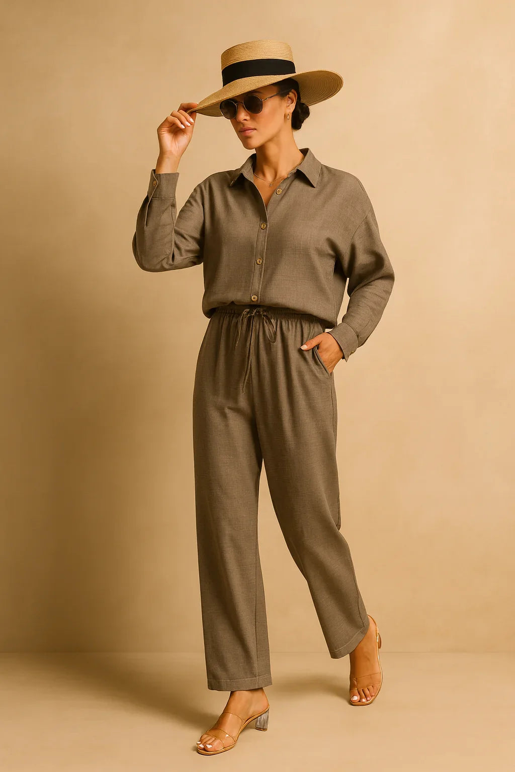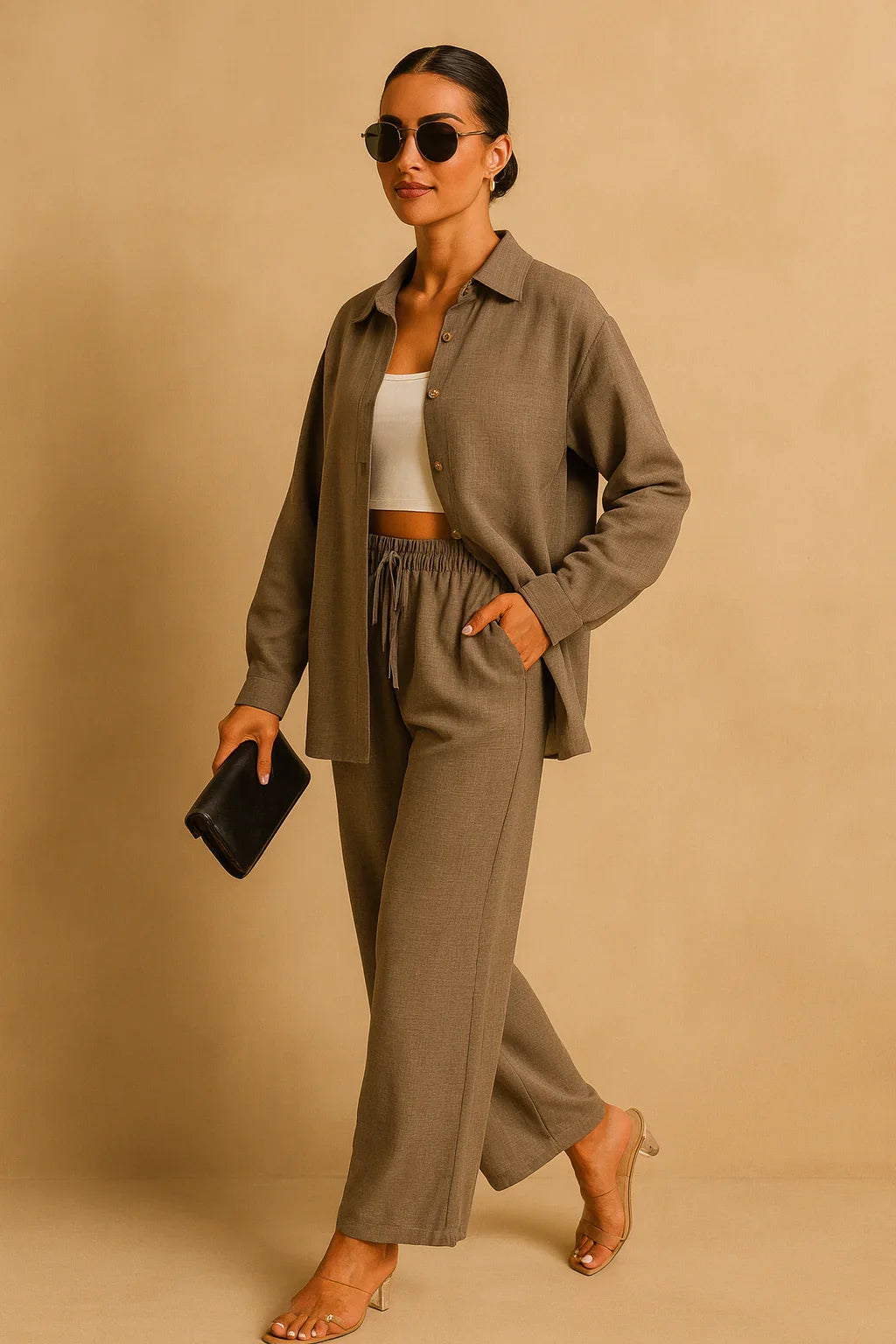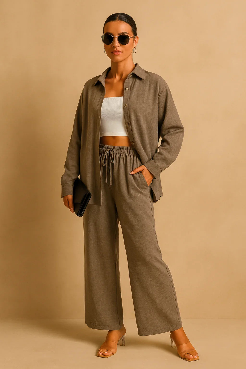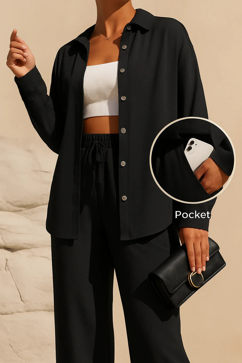 LM131 Women’s Solid Button Front Shirt& Tie Front Wide Leg Pants With Pocket Tow-piece Set - 131 huihe S LumosModesty