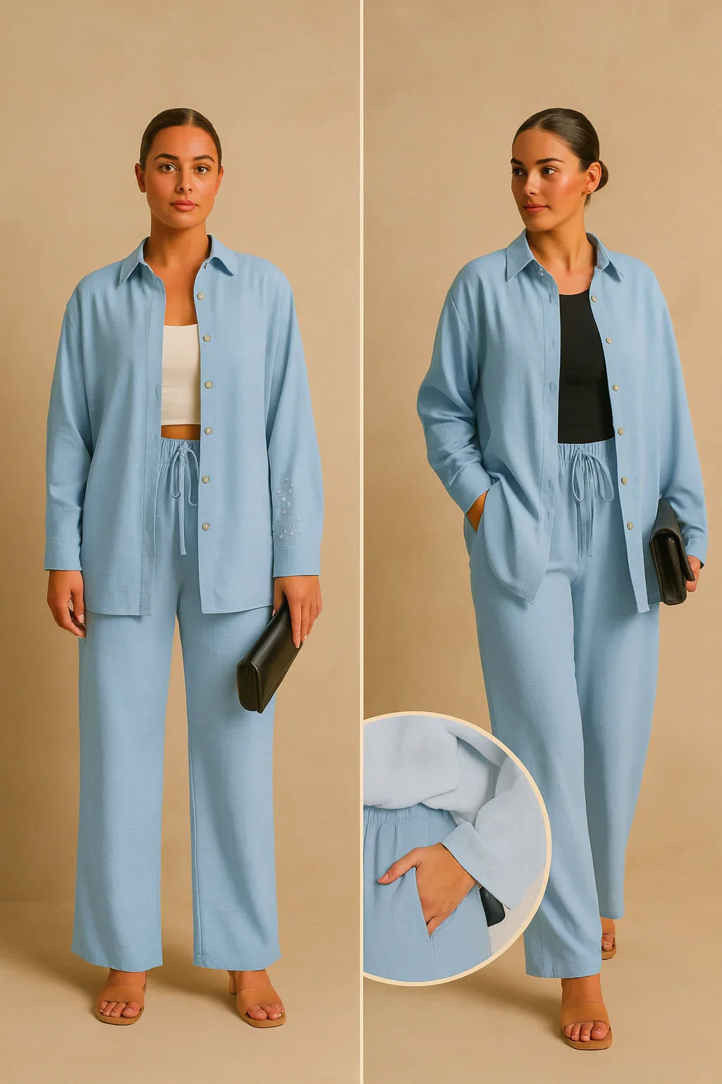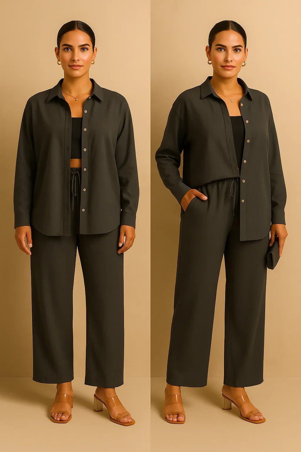 The LM131 Modest Two-piece Set is perfect for both relaxed everyday wear and modest office attire. With its flowy wide-leg pants and tailored button-front shirt, this outfit balances ease and elegance. Style it with a chiffon hijab or oversized khimar for a complete look.