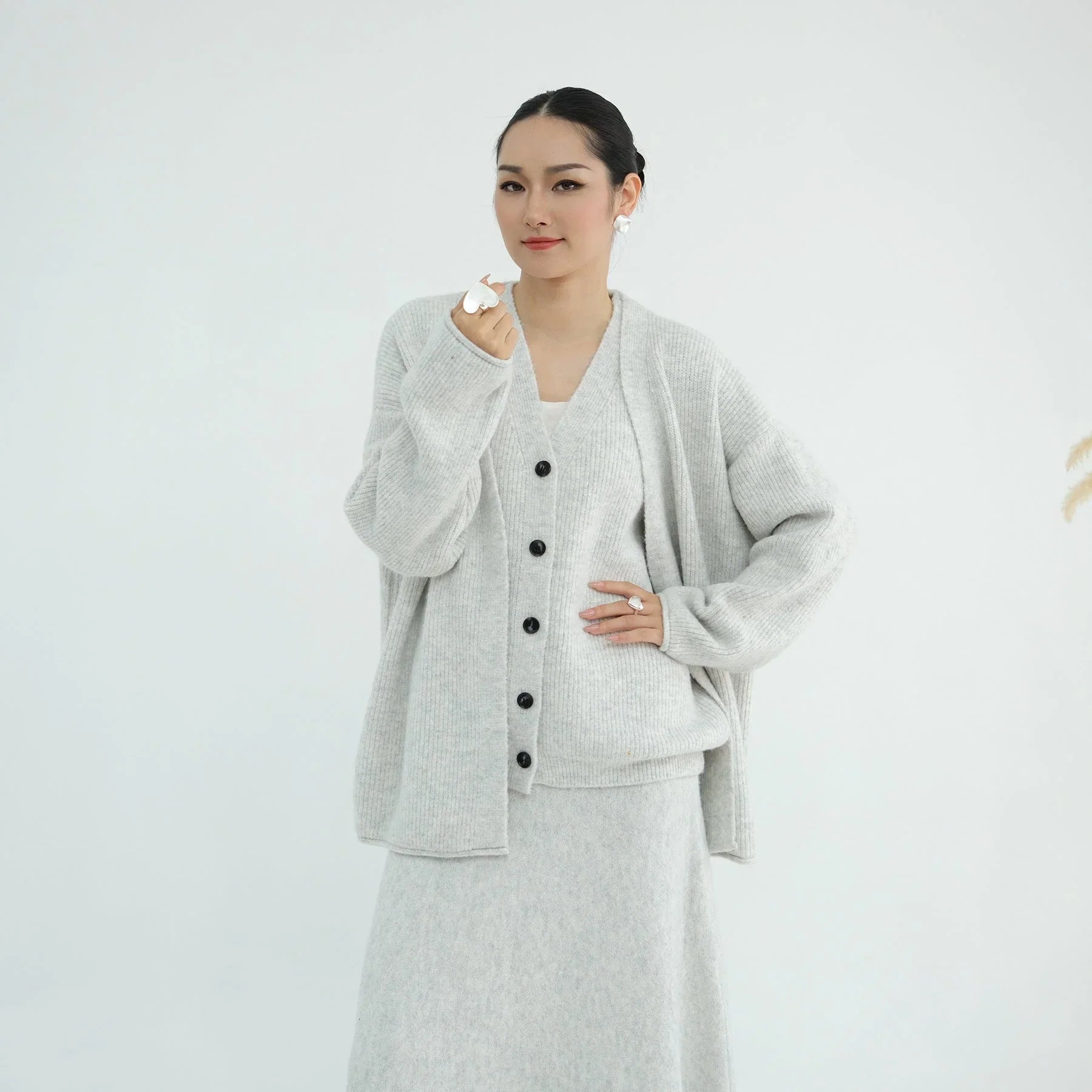 The LM225 3-Piece Knit Set is designed for modern Muslim women who value both modesty and style. This thoughtfully crafted winter ensemble includes a cardigan, vest, and skirt that can be mixed and matched for various occasions while keeping you warm and elegant throughout the cold season.