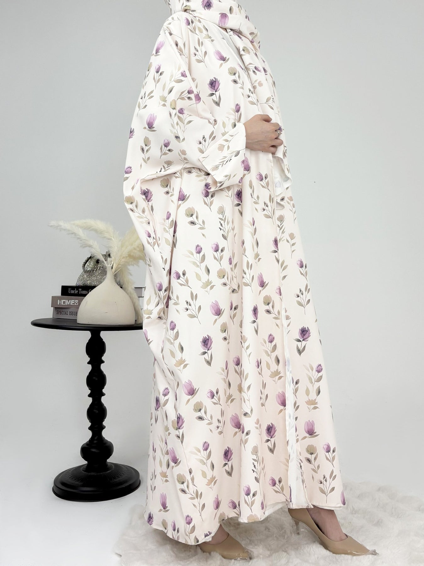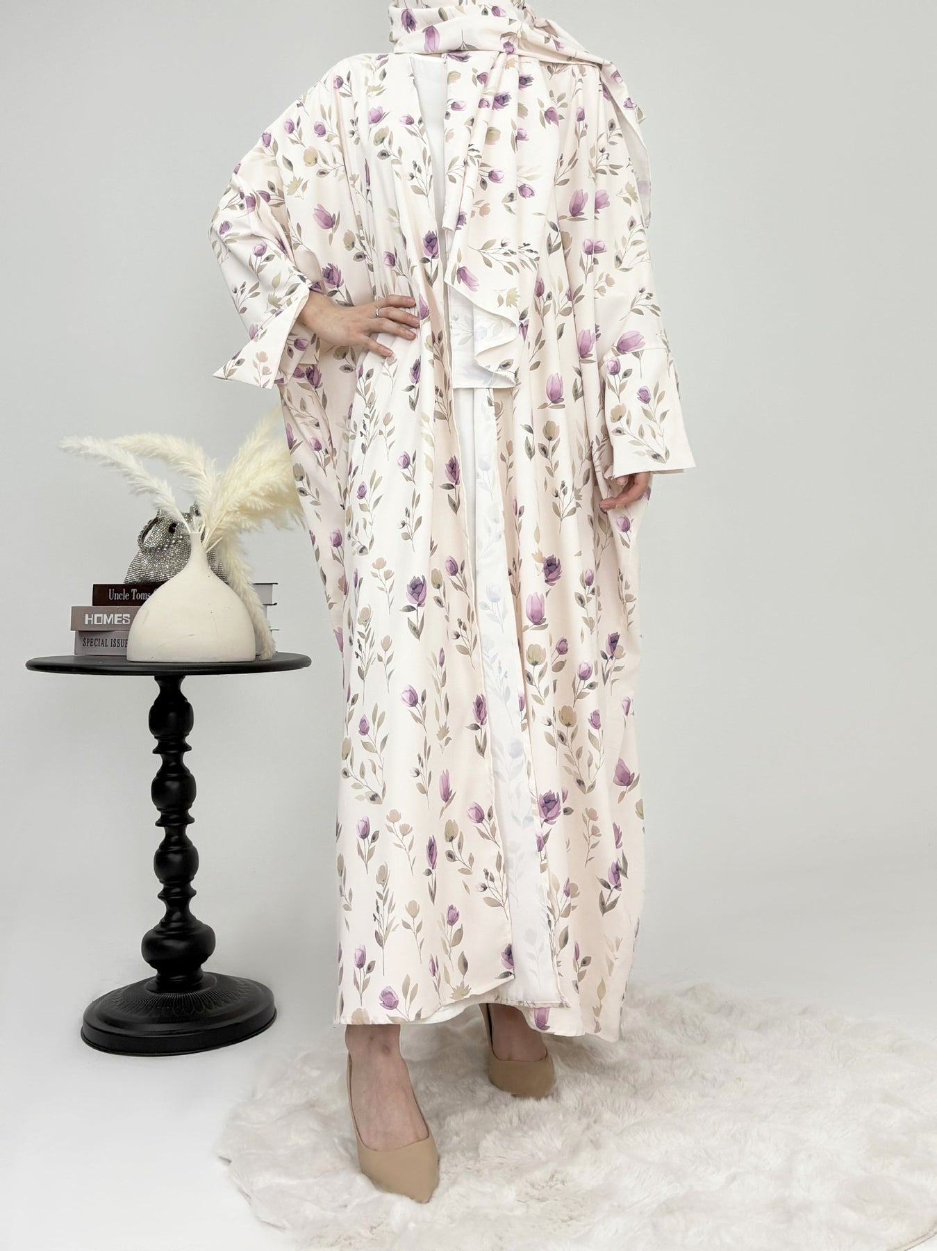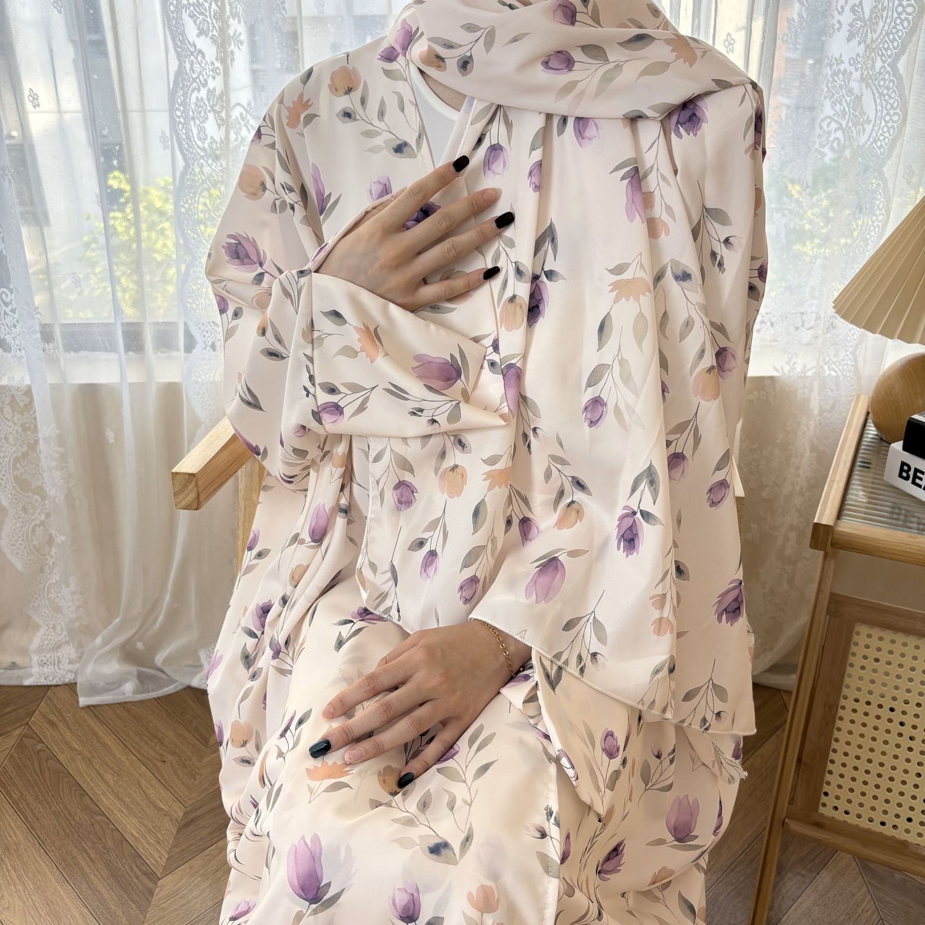 - Layer over a solid-color inner abaya or modest dress to let the floral print take centre stage
